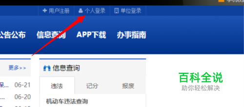 选好省市后,然后点击交通安全综合服务管理平台右上角的个人登录,图中箭头已经指出。