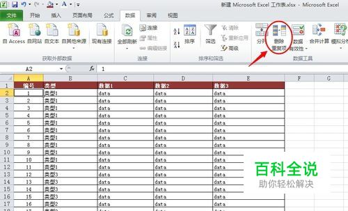 选择有数据的单元格,如果选择其他单元格,则后续操作无法进行,然后点击工具菜单: 数据->删除重复项。