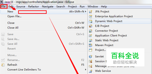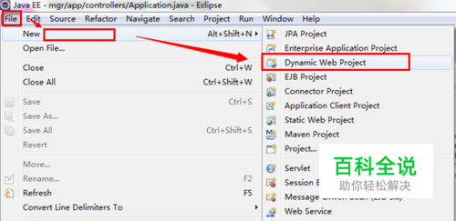 首先,你要先打开Eclipse软件,打开后在工具栏依次点击【File】>>>【New】>>>【Dynamic Web Project】,这个就代表新建的项目是WEB项目 提示:如果没有找到【Dynamic Web Project】请看下一步