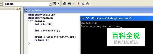 添加源文件absolute.c,编写基本代码,添加头文件math.h(里面有各种的数学库函数,包括了绝对值(absolute value)的求值abs()),编译运行结果就出来了