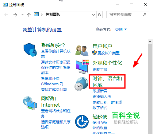 打开控制面板, 点击时钟、语言和区域,如图所示