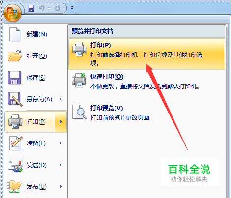 打开“打印设置”界面:在Word程序主界面中,点击“Office按钮”,从其扩展菜单中选择“打印”-“打印设置”项进入。