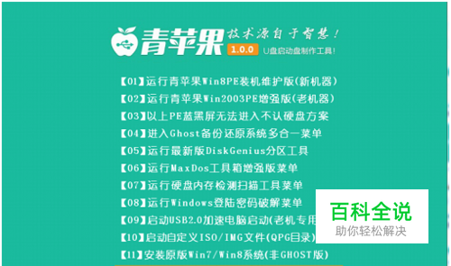 在青苹果的主菜单界面我们通过键盘上的“↑”“↓”将光标移动到【01】运行青苹果Win8PE装机维护版(新机器)进入到青苹果winpe系统。(老机器请选择【02】运行青苹果Win2003PE增加版)