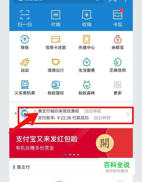 打开支付宝APP,我们扫码付款后可以在【首页】里看到“惠支付喊你来领优惠啦”,点击进入。