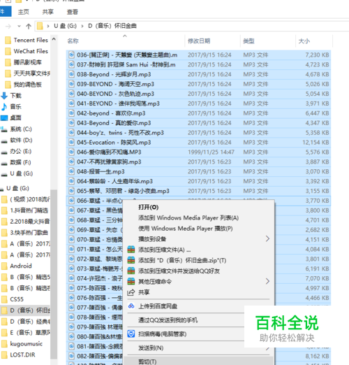 点击菜单列表,选择全部发送到移动设备,然后U盘里就会生成kugoumusic文件夹,里面就是你导入的歌曲跟生成的krc、lrc两种格式歌词文件。等传输完成自己再全选放到原先的文件夹就可以了。