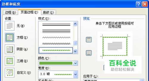 在弹出的界面上选择“方框”,选择样式、颜色、宽度、艺术型、应用范围等内容。确认后应用。