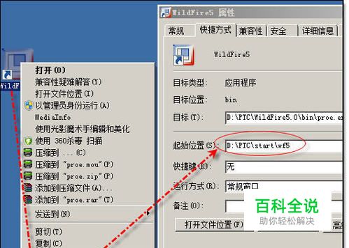 首先在你的桌面上的ProE快捷方式上激活右键菜单,并从菜单中选择【属性】激活属性对话框,并在【起始位置】输入框内设置或得到你的启动目录并记下来。