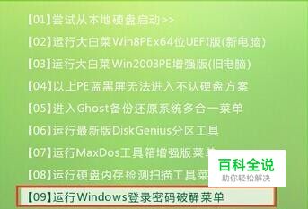 1.BIOS设置u盘启动后,重启电脑进入大白菜主菜单界面,移动光标选择“【09】运行Windows登录密码破解菜单”回车确认。如下图所示