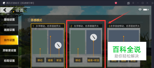 选择其中的第二种操作模式,如图: 游戏默认的设置是第一种模式,但开火位置在屏幕左上角,导致点击屏幕其他位置开不了火。