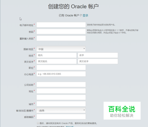 此处以进入Oracle官网,创建Oracle账户,如果已经有账户,则跳过此步。 创建账户时,只需要邮箱、密码是真实有效的,用于登录的,其他信息都可以随便填写。之后进入邮箱点击Oracle发送的链接验证一下邮箱有效即可。