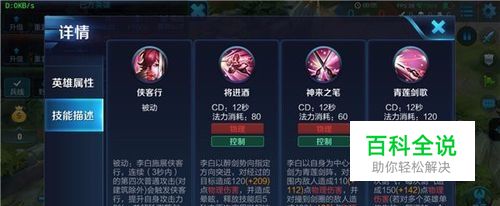 二技能:神来之笔 解析:二技能的伤害虽然不高,但却有着不可小觑的作用。在释放期间李白处于不可被选中的状态,可以用来闪避敌人的主要技能。对于触碰到青莲剑阵边缘的敌人将会受到减速以及额外的伤害,在抓人时利用该技能可以很好的留住敌人。