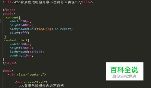 方法二:定位法 设置文字内容和背景内容不在一个层上。让文字内容浮动到半透明的背景层上。如果你的文字在半透明背景层的下面,要设置z-index的值让文字位于背景的上面就行了。