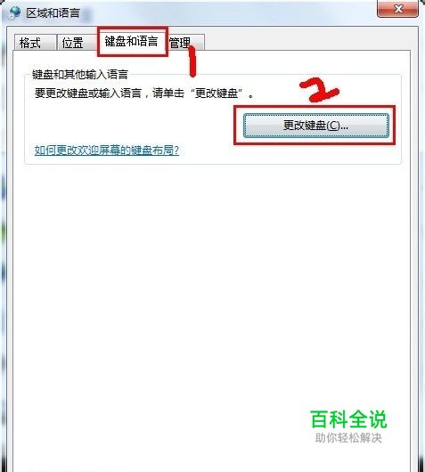 在弹出的区域和语言对话框上边选择【键盘和语言】并单击更改键盘。