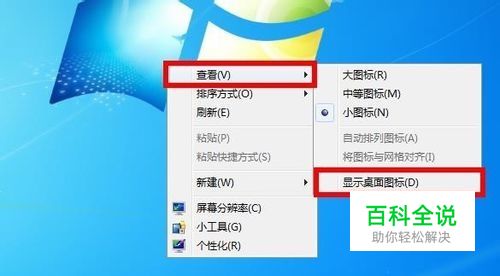 1、有时候点击鼠标失误可能将右键的“显示桌面图标”前面的√给去掉了,现在我们将“显示桌面图标”的勾恢复就可以了!只需要鼠标在桌面空白处“右键”---“查看“---”显示桌面图标“的√勾上即可!