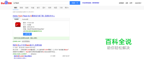 但有时插件的官方网站访问人多,下载会卡,我们可以打开搜索,输入 浏览器名称(或类型) +flash,比如图例中是 IE flash,回车后进入其软件中心下载;下载结束后,点击安装即可。