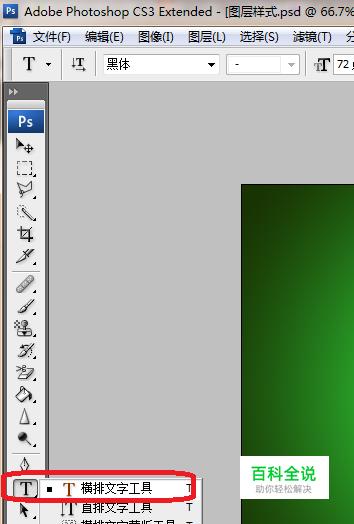 2、单击在边工具栏,选择横排文字工具。