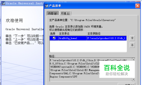 方法2、在oracle卸载界面添加路径 在oracle卸载弹窗中,点击“已安装产品”--》“环境”选项卡 ,勾选 已有的oracel主目录即可。 可以看到,“路径”窗口里显示的字符串值 即为系统环境便令Path的值。