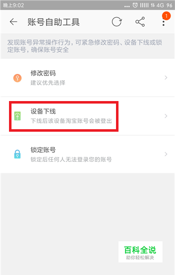 在接下来的界面中可以选择【设备下线】,这样我们可以禁止该设备再次登陆我们的淘宝账号,或者可以修改密码保护淘宝账号。