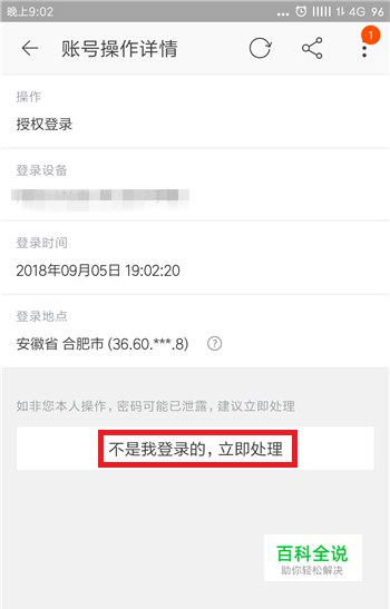 点击后会进入到账号操作详情界面,可以看到这次登陆的具体时间、地点以及手机型号,如果不是我们登陆的可以点击【不是我登陆的,立即处理】选项。