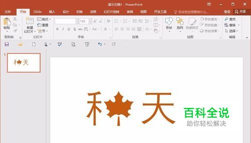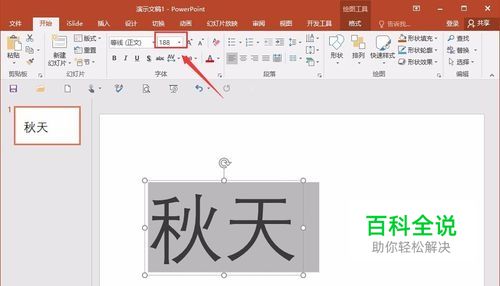 第一步,以“秋天”来举例,先在新建的ppt中,选择插入文本框,然后输入文字,字体可以不限制,主要是字号要大,因为操作起来会简单一些。