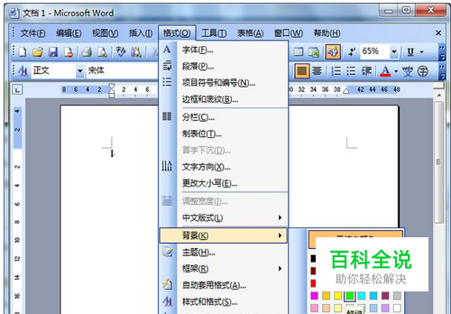 首先,打开文档,然后单击菜单栏上的“格式”下拉列表中的“背景”,此时你就可以在里面任意挑选自己喜爱的颜色;