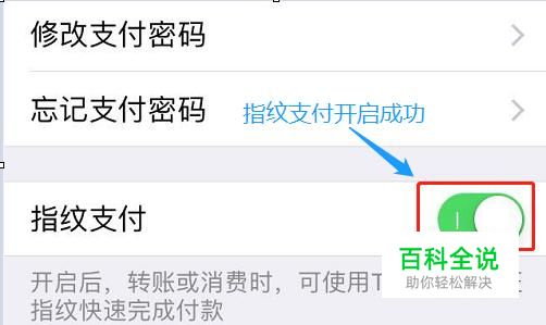 将右侧的开关拨到右侧即可打开指纹支付功能了,不过开启之前系统需要我们输入支付密码才行,支付密码无误的话,指纹支付也就算开通成功了,此时显示为下图的样式,以后我们通过微信付款的时候,会弹出指纹支付的提示;