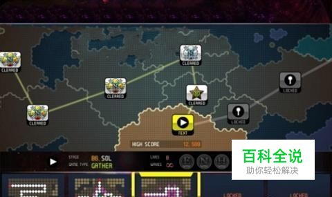 关卡界面信息,游戏关卡以A-E字母 数字序号来编号,第1关为A1,最后一关为E8,共40关;每通过一关会有相应的过关图示,上面同样会有字母标识(该字母表示此关的难度等级)。标有“NEXT”的为下一步将要过关的关卡;标有“LOCKED”的为未解锁的关卡(通过上一关将自动解锁下一关,不能跳选关卡)。界面最下方可以选择游戏难度(EASY/NORMAL/HARD)。