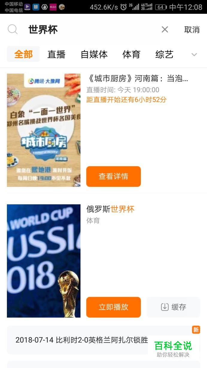 在搜索栏中输入世界杯,在出现的页面中,点击世界杯视频