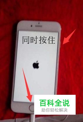 苹果手机出现白屏的现象,可能是死机导致,在这种情况下,同时按下【主屏Home+电源】按钮不放,强制重新启动 iPhone 手机,看是否可以解决问题,如图所示。