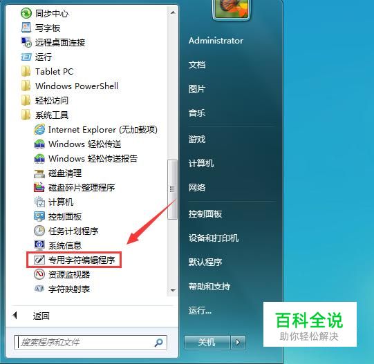 打开电脑之后我们在开始里找到附件选项,点击该选项我们在它的子级菜单里找到系统工具选项,点击该选项之后在里面找到专用字符编辑程序选项,如图所示: