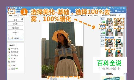 第一步:打开图片,选择美化工具,在右侧点击基础,选择暖化和去雾。
