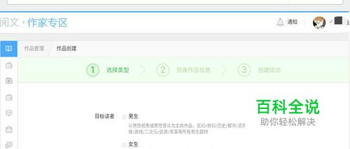 申请好后,再点击左边蓝色部分,如图所示,会有新建作品是字样,点击。选择是男频还是女频,之后会要你填写作品名,简介之类的。创建作品要先上传两千字以上进行审核,审核通过之后才能搜索到自己的作品。