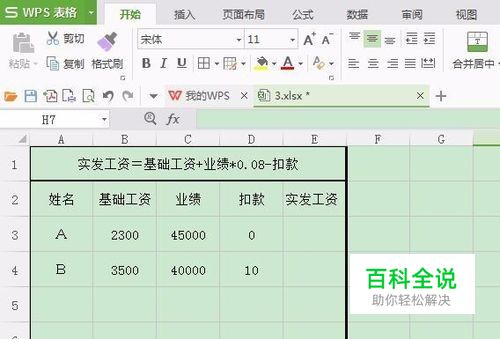 函数创建: 在实发工资E3单元格输入“=”,如下图红色圈圈所示: