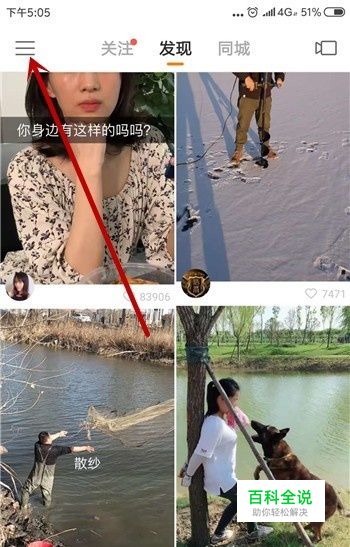 在进入快手后点击左上角的【三】打开更多选项。