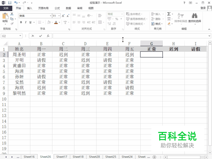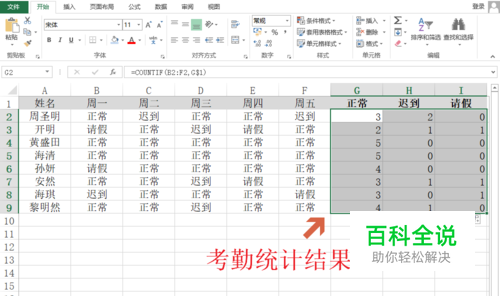 输入统计考勤的函数公式。 在G2单元格内输入用于统计考勤的函数公式“=COUNTIF(B2:F2,G$1)”,注意“G”和“1”之间的美元符号$一定不要缺少,否则后面拉伸填充的时候会出现问题。