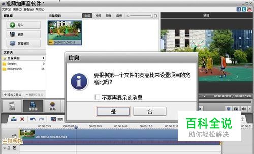 随后弹出一个信息提示框,是否要根据第一个文件的宽高比来设置项目的宽高比,选择“是”。然后添加的视频文件显示在媒体库上,同时也导入到时间轴下方的“主视频轨道”上了,如下图所示。