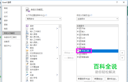 打开开发工具面板(默认是没有开发工具选项卡的) 【文件】->【选项】->【自定义功能区】