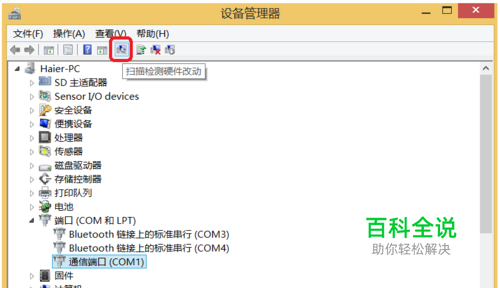 返回到“设备管理器”界面,选择“扫描检测硬件改动”。