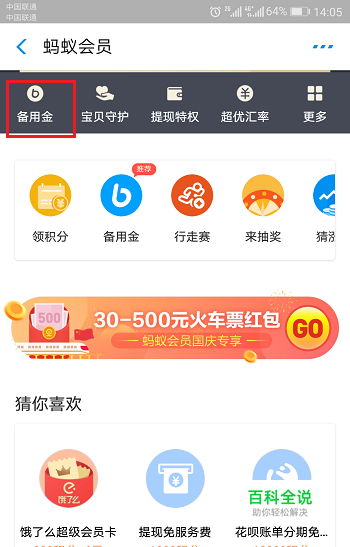 第二步进去蚂蚁会员界面之后,点击备用金,如下图所示: