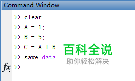比如在Command窗口输入以下变量与计算式: >> clear; >> A = 1; >> B = 5; >> C = A + B; >> save data.txt -ascii -double 如上操作后,即实现将数据用双精度存入ASCII码方式文本文件data.txt
