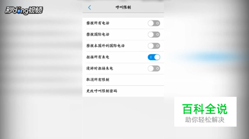 点击“呼叫限制”,将“拒绝所有来电”后面的开关打开即可设置成功。