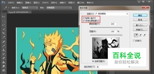 首先,打开需要处理的图片,点击“选择>色彩范围”选项,在弹出对话框中点选“取样颜色”,然后点击图片中需要取样的地方,并设置好“颜色容差”和“范围”属性,如图所示。由于需要的部分有多种颜色,而背景只有一种颜色,我们先选取背景的颜色选区。