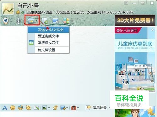打开需要发送文件的好友对话框,点击“传送文件”中的“发送文件/文件夹”:如图