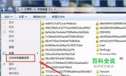 进入C盘后,点开“组织”展开后可以看到“文件夹和搜索选项”,点击这个菜单打开