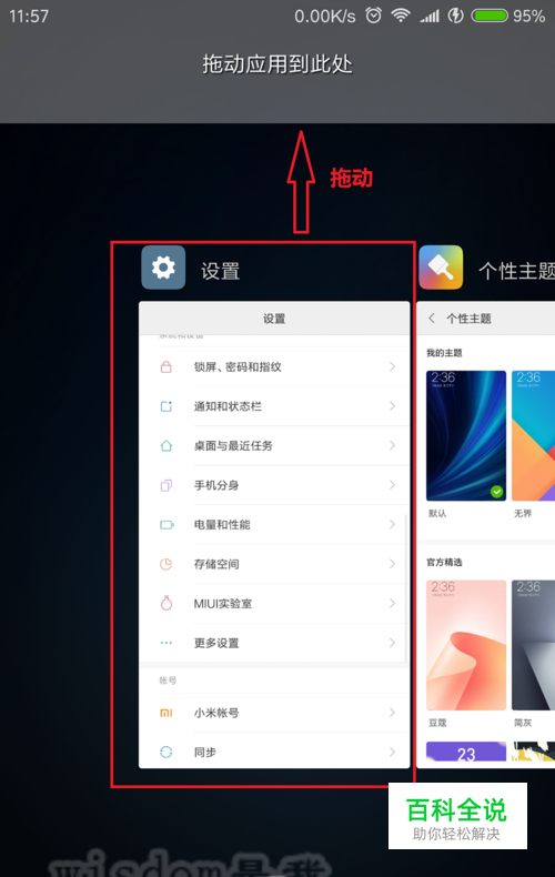 点击了分屏模式以后,拖动需要的分屏显示的应用进程,拖到上方,松手即可,如图所示。