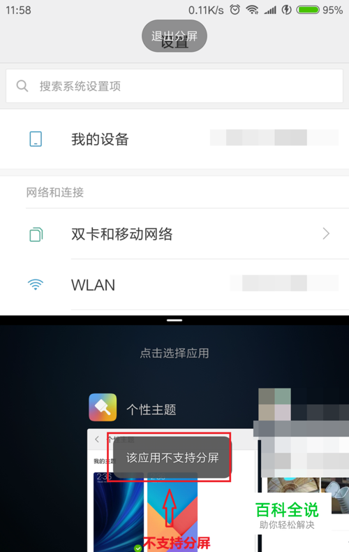 接着下半部分如果出现不支持分屏的应用,会显示相关的字提示该应用不支持分屏操作,如图所示,接着选择一个可以支持分屏操作的即可,如图所示。