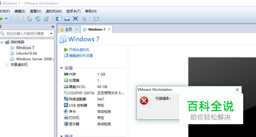故障场景重现:如下图,当开启虚拟机,就会弹出一个窗口,提示我们“内部错误”。