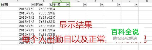 记得数据的形式和时间的格式一致,定义筛选方式。点击确定即可显示正常上班的人。