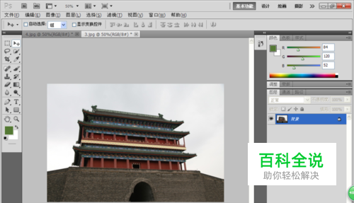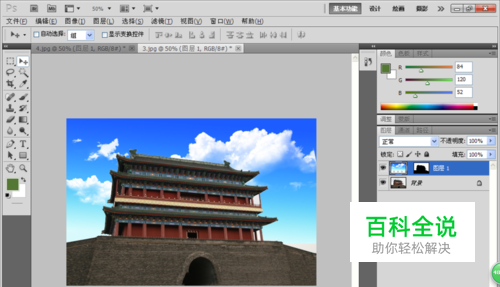 打开PS,打开一张城楼图片,如图所示。按crl+O打开图片,发现图片中的背景颜色带有灰白色,衬托着城楼的景色显得很不漂亮,所以更换一张蓝天白云图片比较好。