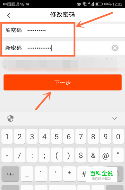 5.第五步,在上方输入“ 原密码”和“ 新密码”,再点击下方的“ 下一步”按钮;